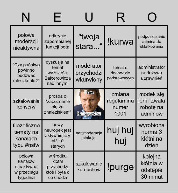 This bingo card has a free space and 44 words: wołanie do bezbeków, kolejna kłótnia w odstępie 30 minut, film/gif reakcyjne, połowa kanałów nieaktywna w przeciągu tygodnia, administrator ewidentnie potrzebuje urlopu, !purge, "twoja stara...", gównoburza, podpuszczanie admina do sklatkowania, w środku kłótni przychodzi ktoś i pyta o co chodzi, !kurwa, zmiana regulaminu numer 1001, nazimoderacja atakuje, nowy neuropek jest aktywniejszy niż 10 starych, postuje aktywnie max 5 osób, szkalowanie komuchów, szkalowanie Jasia Kapeli lub Jasia Meli, szkalowanie konserw, admin przychodzi wkurwiony, administrator nadużywa uprawnień, odkrycie zapomnianej funkcji bota, syf i smród (wolna interpretacja), temat okołojedzeniowy nie na #gotowanie, połowa moderacji nieaktywna, "ale się ... zesrały", modek się leni i zwala robotę na adminów, rage/emo quit z serwera, powrót z rage/emo quita, huj huj huj, filozoficzne tematy na kanałach typu #nsfw, grożenie wyjściem z serwera, wyrobiona norma 3 kłótni na dzień, wołanie połowy serwera do "dobranoc", "pikanteria na serwerze" czy rozmowy o spermie, prośba o "zapoznanie się ze znaleziskiem", gównoposty na #ogólny a na #strefa-pajacowania cicho, kłótnia na linii admin i użytkownik, użytkownik przychodzi wkurwiony, moderator przychodzi wkurwiony, "Czy państwo powinno budować mieszkania?", temat o dochodzie podstawowym, homofobia i śmianie się z osób nie-hetero, dyskusja na temat wyższości Balcerowicza nad innymi and dosrywanie i szkalowanie.