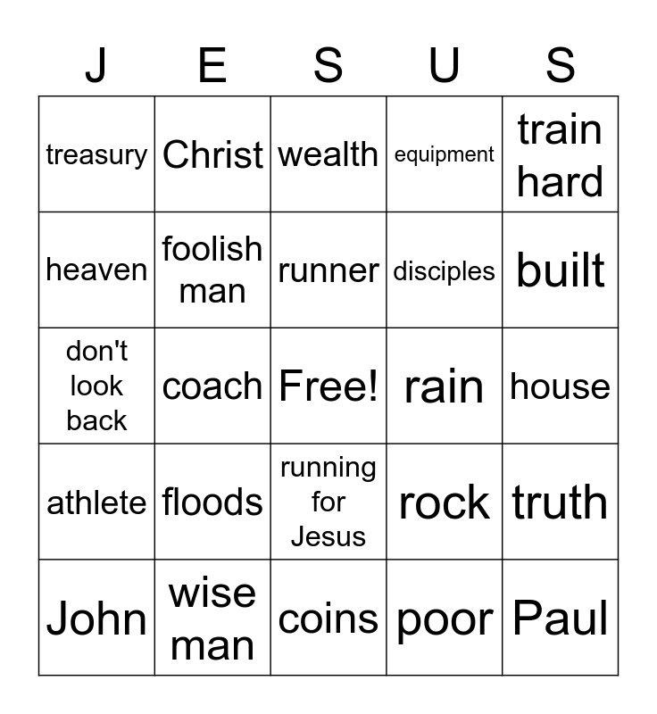 This bingo card has a free space and 41 words: don't give up, don't look back, keep the faith, foolish man, wise man, running for Jesus, runner, goal, train hard, athlete, coach, equipment, Paul, house, rain, floods, mite, treasury, widow, wealth, truth, money, coins, disciples, rich, temple, poor, offering, built, Peter, confession, Christ, John, kingdom, rock, heaven, prophets, gates, church, sand and wind.