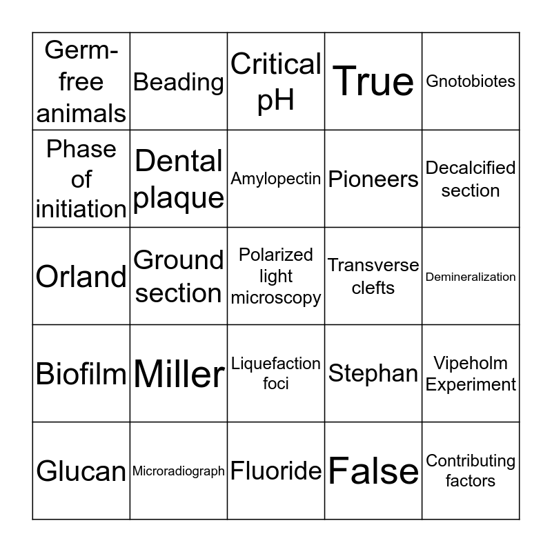 This bingo card has 25 words: Miller, Fluoride, Amylopectin, Glucan, Gnotobiotes, Germ-free animals, Phase of initiation, Beading, Transverse clefts, Liquefaction foci, Pioneers, Orland, Stephan, Vipeholm Experiment, Dental plaque, Contributing factors, Demineralization, Critical pH, Decalcified section, Ground section, Polarized light microscopy, Microradiograph, Biofilm, True and False.