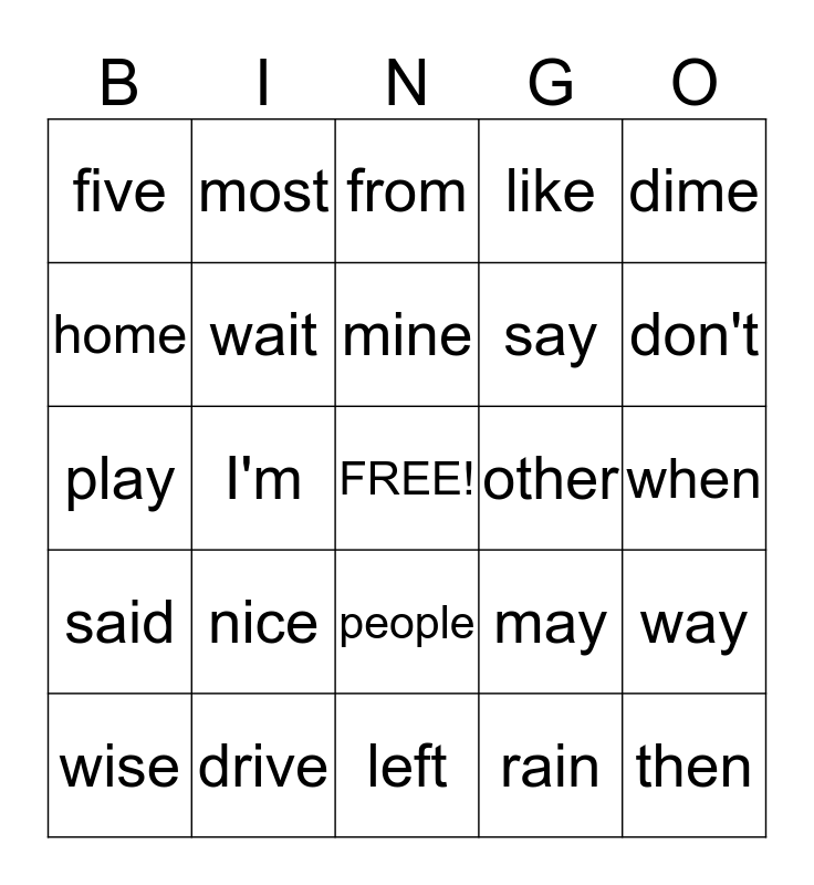 This bingo card has a free space and 24 words: nice, drive, mine, wise, dime, five, home, most, other, people, say, play, may, way, wait, rain, when, from, don't, I'm, then, said, like and left.