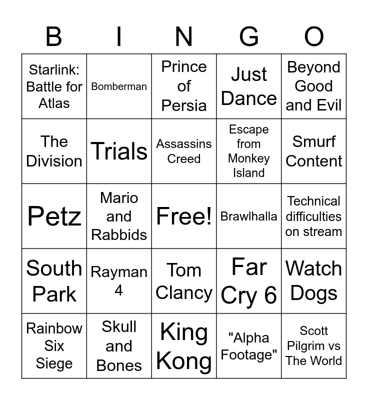This bingo card has a free space and 24 words: Rayman 4, Skull and Bones, Assassins Creed, Rainbow Six Siege, Beyond Good and Evil, Starlink: Battle for Atlas, The Division, Bomberman, Brawlhalla, Tom Clancy, Escape from Monkey Island, Petz, Far Cry 6, Watch Dogs, Trials, "Alpha Footage", Technical difficulties on stream, Prince of Persia, Smurf Content, Mario and Rabbids, Scott Pilgrim vs The World, South Park, Just Dance and King Kong.