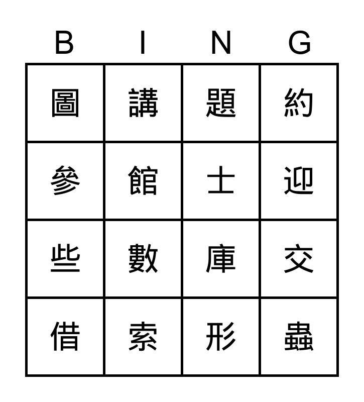 This bingo card has 16 words: 索, 交, 題, 圖, 些, 講, 庫, 形, 參, 館, 借, 約, 數, 迎, 士 and 蟲.