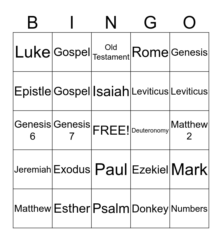 This bingo card has a free space and 24 words: Exodus, Esther, Isaiah, Matthew, Genesis, Luke, Epistle, Gospel, Deuteronomy, Paul, Leviticus, Genesis 6, Ezekiel, Mark, Gospel, Donkey, Matthew 2, Old Testament, Leviticus, Genesis 7, Numbers, Jeremiah, Rome and Psalm.