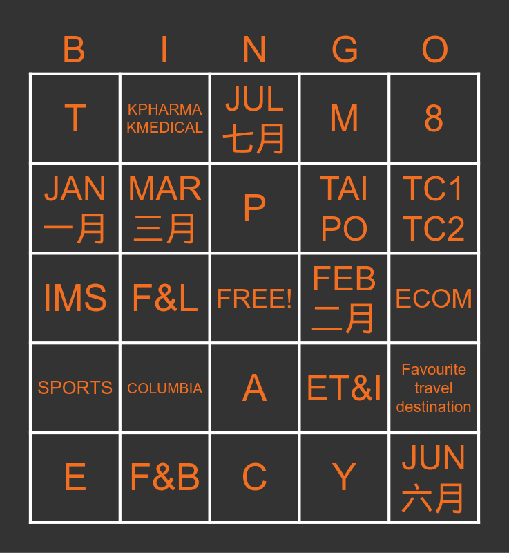 This bingo card has a free space and 24 words: COLUMBIA, F&B, P, E, 8, T, JAN 一月, KPHARMA KMEDICAL, FEB 二月, A, TAI PO, IMS, ET&I, Favourite travel destination, MAR 三月, Y, ECOM, JUL 七月, TC1 TC2, F&L, JUN 六月, SPORTS, M and C.