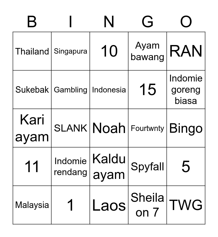This bingo card has a free space and 24 words: Indomie rendang, 1, Indonesia, Malaysia, RAN, Thailand, Sukebak, Singapura, Fourtwnty, Kaldu ayam, 15, Kari ayam, Spyfall, 5, Gambling, Sheila on 7, Bingo, 10, Indomie goreng biasa, SLANK, TWG, 11, Ayam bawang and Laos.