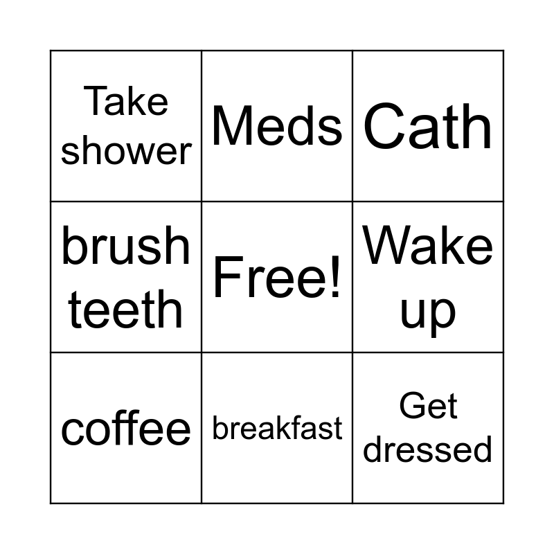 This bingo card has a free space and 8 words: Wake up, Cath, Meds, coffee, Take shower, Get dressed, brush teeth and breakfast.