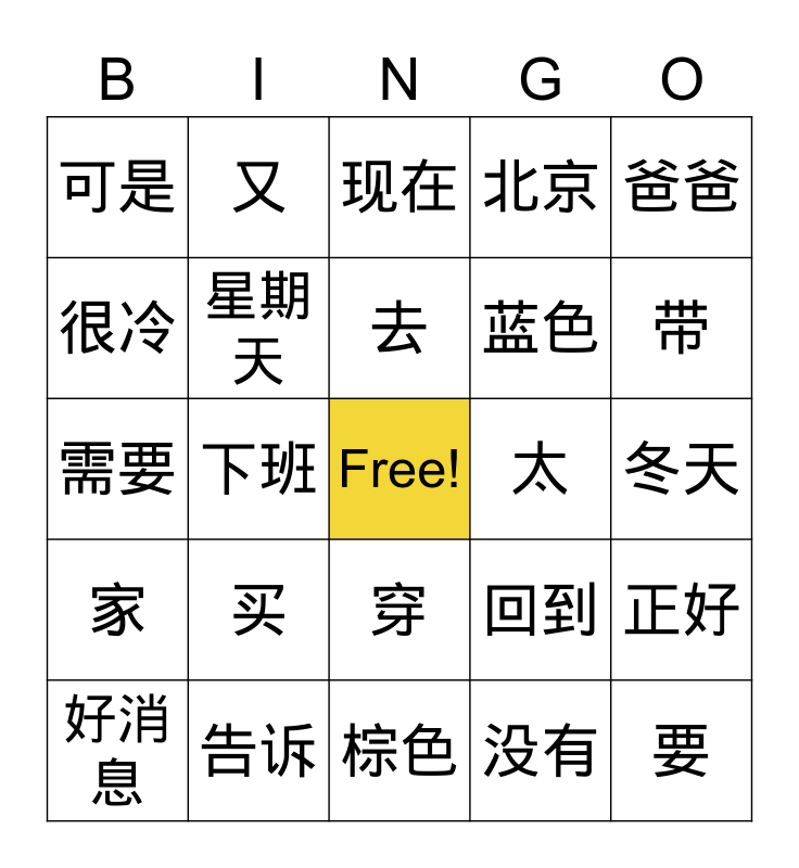This bingo card has a free space and 24 words: 买, 告诉, 去, 好消息, 爸爸, 可是, 很冷, 又, 太, 穿, 蓝色, 需要, 回到, 正好, 星期天, 没有, 冬天, 现在, 带, 下班, 要, 家, 北京 and 棕色.