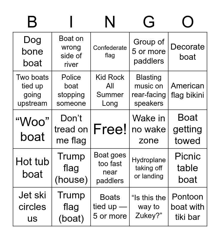 This bingo card has a free space and 24 words: Trump flag (house), Trump flag (boat), Kid Rock All Summer Long, Jet ski circles us, Decorate boat, Dog bone boat, Two boats tied up going upstream, Boat on wrong side of river, Wake in no wake zone, Boat goes too fast near paddlers, Blasting music on rear-facing speakers, “Woo” boat, Hydroplane taking off or landing, Picnic table boat, Police boat stopping someone, “Is this the way to Zukey?”, Boat getting towed, Confederate flag, American flag bikini, Don’t tread on me flag, Pontoon boat with tiki bar, Hot tub boat, Group of 5 or more paddlers and Boats tied up — 5 or more.