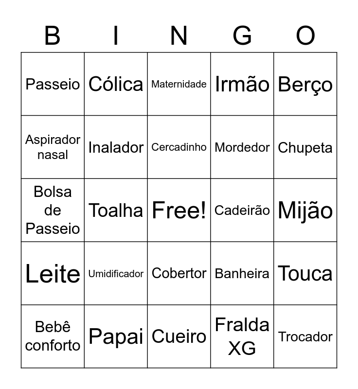 This bingo card has a free space and 70 words: Helena, Mijão, Sapatinho, Meia, Papai, Mamãe, Irmão, Ninho, Berço, Luva, Touca, Macacão, Passeio, Maternidade, Manta, Toalha, Cobertor, Mordedor, Mamadeira, Leite, Cadeirão, Banheira, Chupeta, Babador, Fralda RN, Fralda P, Fralda M, Fralda G, Fralda XG, Termômetro, Cólica, Carrinho, Canguru, Andador, Perfume, Fralda de Boca, Talco, Cotonete, Beta HCG, Aspirador nasal, Conta gotas, Umidificador, Trocador, Pomada, Balança, Inalador, Bebê conforto, Algodão, Papinha, Tesourinha, Lenço Umedecido, Móbile, Galinha Pintadinha, Mundo Bita, Cueiro, Babá Eletrônica, Cercadinho, Bebê, Calça, Chocalho, Bolsa de Passeio, Brinquedo, Pelúcia, Body Manga Curta, Body Manga Longa, Escova de Cabelo, Amor, Carinho, Afeto and Naninha.