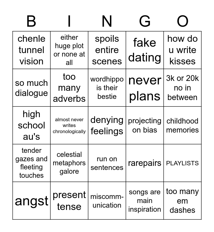 This bingo card has 25 words: celestial metaphors galore, miscomm-unication, wordhippo is their bestie, angst, how do u write kisses, chenle tunnel vision, so much dialogue, either huge plot or none at all, projecting on bias, run on sentences, never plans, high school au's, rarepairs, PLAYLISTS, too many adverbs, too many em dashes, childhood memories, spoils entire scenes, 3k or 20k no in between, almost never writes chronologically, denying feelings, present tense, tender gazes and fleeting touches, fake dating and songs are main inspiration.