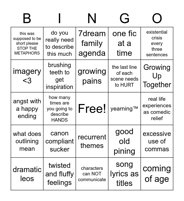This bingo card has a free space and 24 words: canon compliant sucker, twisted and fluffy feelings, growing pains, dramatic leos, existential crisis every three sentences, this was supposed to be short please STOP THE METAPHORS, imagery <3, do you really need to describe this much, yearning™, recurrent themes, the last line of each scene needs to HURT, angst with a happy ending, good old pining, excessive use of commas, brushing teeth to get inspiration, song lyrics as titles, real life experiences as comedic relief, 7dream family agenda, Growing Up Together, how many times are you going to describe HANDS, coming of age, what does outlining mean, one fic at a time and characters can NOT communicate.