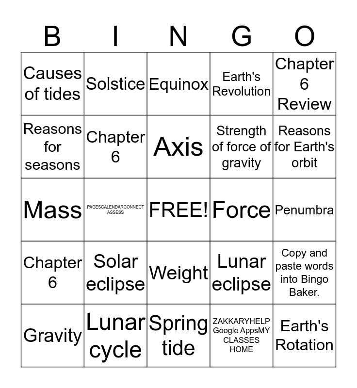 This bingo card has a free space and 32 words: ZAKKARYHELP Google AppsMY CLASSES HOME, SCIENCE 6 - period 3, PAGESCALENDARCONNECT ASSESS, Welcome to sixth grade!, Chapter 6, Chapter 6, Chapter 6 Review, Copy and paste words into Bingo Baker., Solstice, Orbit, Axis, Equinox, Revolution, Rotation, Force, Inertia, Gravity, Mass, Weight, Solar eclipse, Lunar eclipse, Umbra, Penumbra, Lunar cycle, Earth's Rotation, Earth's Revolution, Strength of force of gravity, Reasons for seasons, Causes of tides, Spring tide, Neap tide and Reasons for Earth's orbit.