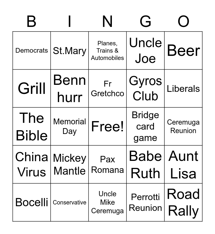 This bingo card has a free space and 34 words: Marble Game, Perrotti Reunion, Latest book he is reading, Trump, China Virus, Benn hurr, Beer, Bocelli, St.Mary, Bit Coin, Fr Gretchco, Planes, Trains & Automobiles, Caitlyn Jenner, Amazon, Bridge card game, Liberals, Conservative, The Bible, Mickey Mantle, Babe Ruth, Pax Romana, Vince Lombardi, Democrats, Ceremuga Reunion, Uncle Mike Ceremuga, Road Rally, Uncle Joe, Uncle Mike Perrotti, Gyros Club, Grill, Sunsetter, Memorial Day, Aunt Lisa and Marr.