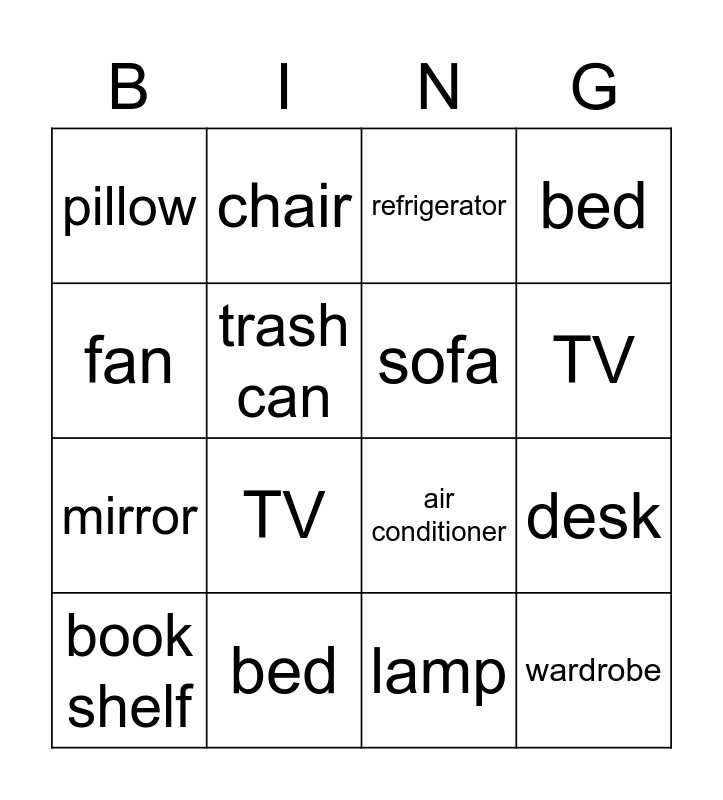 This bingo card has 19 words: air conditioner, table, refrigerator, wardrobe, desk, fan, lamp, pillow, chair, mirror, TV, trash can, sofa, bed, book shelf, window, bed, TV and table.