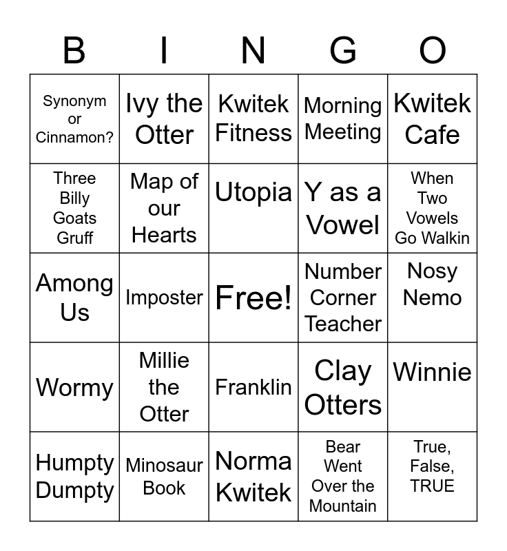 This bingo card has a free space and 24 words: Humpty Dumpty, Millie the Otter, Utopia, Bear Went Over the Mountain, Kwitek Cafe, Synonym or Cinnamon?, Ivy the Otter, Kwitek Fitness, Number Corner Teacher, Nosy Nemo, Among Us, Map of our Hearts, Clay Otters, Winnie, Three Billy Goats Gruff, Minosaur Book, Norma Kwitek, Morning Meeting, When Two Vowels Go Walkin, Wormy, Imposter, Franklin, Y as a Vowel and True, False, TRUE.