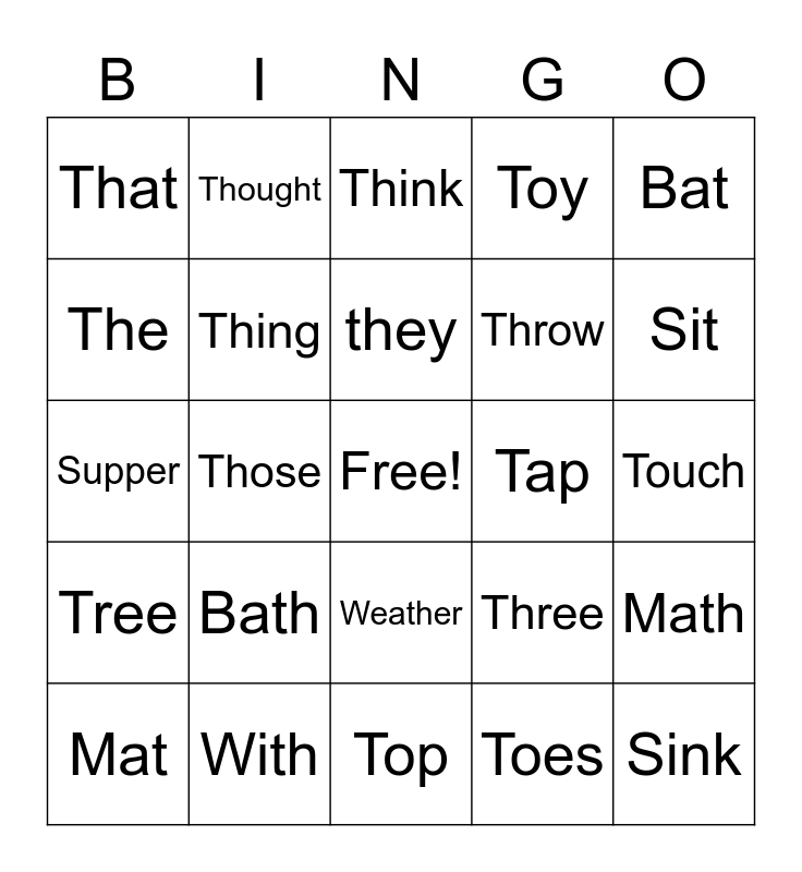 This bingo card has a free space and 30 words: With, These, Those, This, That, Think, Thing, Weather, Tap, Top, Touch, Sink, Toes, Free, Sit, Myth, Three, Tree, Bath, Bat, Supper, Thumb, Thought, Throw, The, Toy, Math, Mat, they and toss.