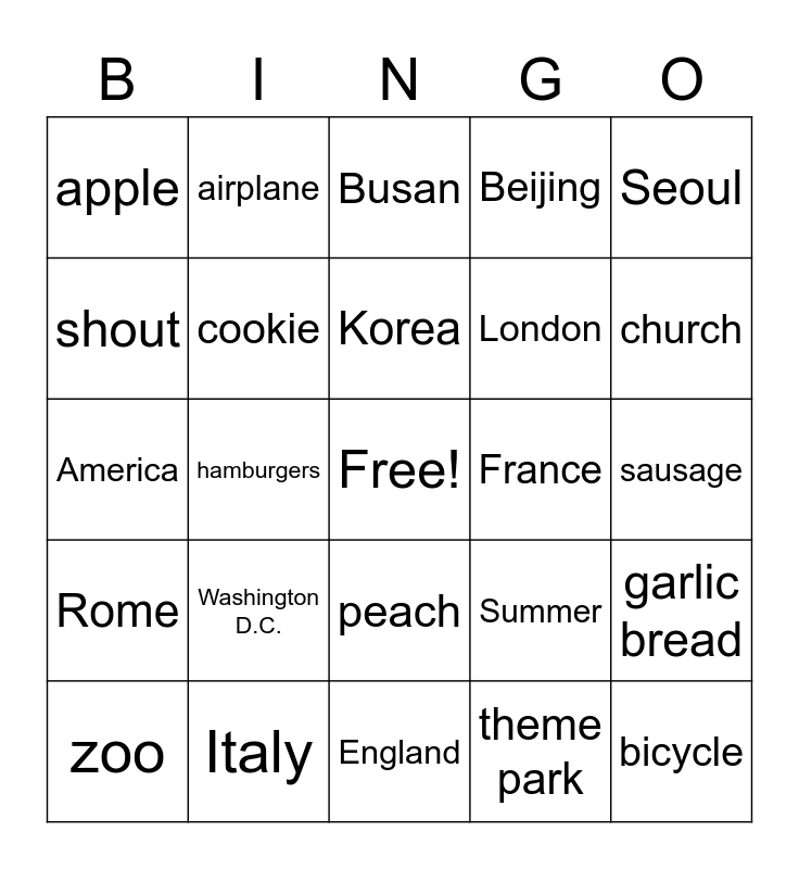 This bingo card has a free space and 69 words: bread, chocolate, cheese, soup, sausage, yogurt, cookie, milk, London, Paris, Rome, Cairo, Beijing, Seoul, Tokyo, Washington D.C., Korea, France, Egypt, America, Italy, England, Summer, vacation, ice tea, cup, apple juice, boat, bicycle, bus, airplane, taxi, subway, car, park, library, market, Jeju Island, church, zoo, New York, Busan, theme park, lemon, pineapple, watermelon, peach, banana, orange, apple, hamburgers, sausages, steak, garlic bread, tomato salad, cookies, milk, orange juice, take photos, shout, climb, touch, eat, run, litter, library, park, potatoes and yogurt.