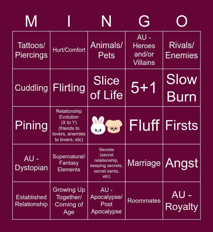 This bingo card has a free space and 24 words: Supernatural/ Fantasy Elements, Growing Up Together/ Coming of Age, Slice of Life, Established Relationship, Rivals/ Enemies, Tattoos/ Piercings, Cuddling, Hurt/Comfort, Fluff, Secrets (secret relationship, keeping secrets, secret santa, etc), 5+1, Pining, Marriage, Angst, Flirting, Roommates, Firsts, Animals/ Pets, Slow Burn, Relationship Evolution (X to Y) (friends to lovers, enemies to lovers, etc), AU - Royalty, AU - Dystopian, AU - Heroes and/or Villains and AU - Apocalypse/ Post Apocalypse.