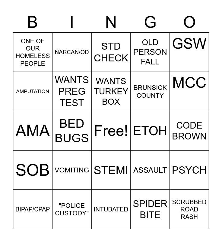 This bingo card has a free space and 24 words: BIPAP/CPAP, VOMITING, WANTS TURKEY BOX, SPIDER BITE, GSW, ONE OF OUR HOMELESS PEOPLE, NARCAN/OD, STD CHECK, ETOH, CODE BROWN, AMA, WANTS PREG TEST, ASSAULT, PSYCH, AMPUTATION, "POLICE CUSTODY", INTUBATED, OLD PERSON FALL, MCC, SOB, BED BUGS, STEMI, BRUNSICK COUNTY and SCRUBBED ROAD RASH.