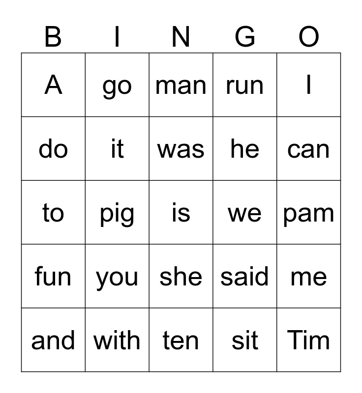 This bingo card has a free space and 24 words: you, with, was, and, I, A, do, go, we, she, he, to, said, me, it, sit, pam, man, can, pig, Tim, fun, run and ten.