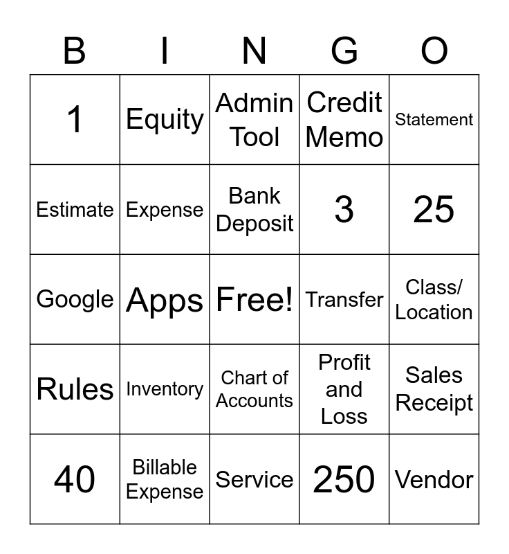 This bingo card has a free space and 47 words: Customer, Vendor, Product, Service, Inventory, Asset, Equity, Liabilities, Estimate, Bill, Expense, Credit Memo, Sales Receipt, Profit and Loss, Balance Sheet, Check, Bank Deposit, Transfer, Journal Entry, Statement, Apps, 250, 1, 3, 5, 25, 40, Unlimited, Chart of Accounts, Rules, Project, Reconcile, Register, Dashboard, Undeposited Funds, Billable Expense, Class/ Location, Purchase Order-, Oii, CS Server, Salesforce, Admin Tool, Google, IBoss, Knowledge Base, STAR and Sentinel.