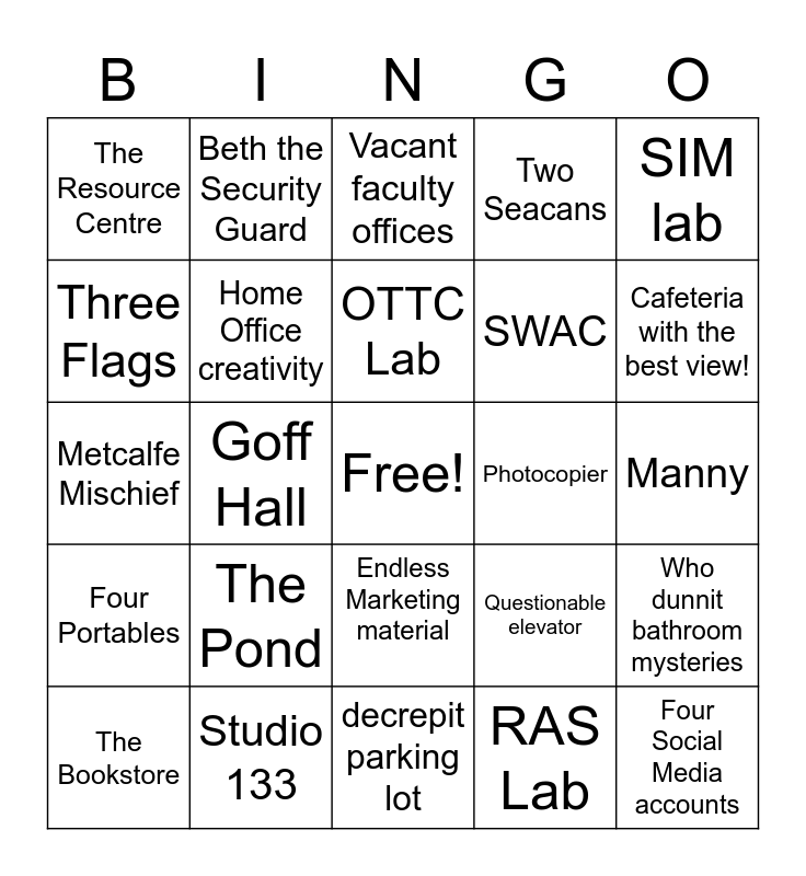 This bingo card has a free space and 24 words: The Pond, Studio 133, OTTC Lab, The Bookstore, SIM lab, The Resource Centre, Three Flags, Beth the Security Guard, Photocopier, Endless Marketing material, SWAC, Metcalfe Mischief, Questionable elevator, Who dunnit bathroom mysteries, Home Office creativity, RAS Lab, Manny, Vacant faculty offices, Cafeteria with the best view!, Goff Hall, Four Social Media accounts, Four Portables, Two Seacans and decrepit parking lot.