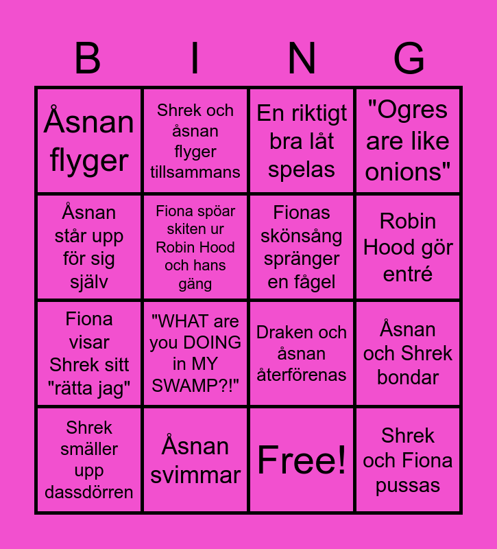 This bingo card has 17 words: Free!, Shrek smäller upp dassdörren, En riktigt bra låt spelas, Åsnan flyger, "WHAT are you DOING in MY SWAMP?!", "Ogres are like onions", Åsnan och Shrek bondar, Fionas skönsång spränger en fågel, Robin Hood gör entré, Fiona spöar skiten ur Robin Hood och hans gäng, Åsnan svimmar, Draken och åsnan återförenas, Åsnan står upp för sig själv, Shrek och åsnan flyger tillsammans, Fiona visar Shrek sitt "rätta jag", "Celebrity marriages, they never lasts" and Shrek och Fiona pussas.