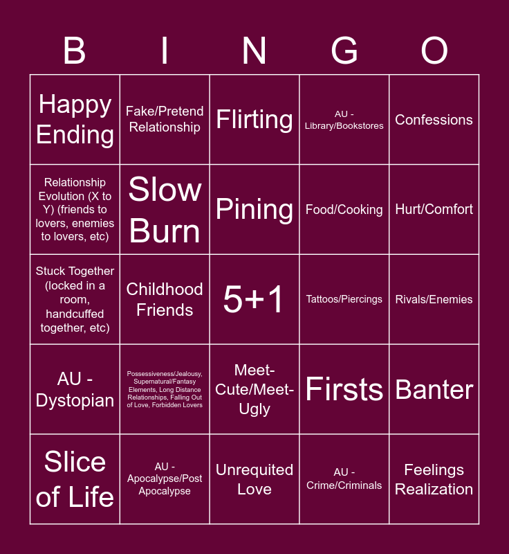 This bingo card has 25 words: Possessiveness/Jealousy, Supernatural/Fantasy Elements, Long Distance Relationships, Falling Out of Love, Forbidden Lovers, Unrequited Love, Pining, Slice of Life, Confessions, Happy Ending, Relationship Evolution (X to Y) (friends to lovers, enemies to lovers, etc), Fake/Pretend Relationship, Tattoos/Piercings, Meet-Cute/Meet-Ugly, Food/Cooking, Stuck Together (locked in a room, handcuffed together, etc), Firsts, Banter, Slow Burn, Feelings Realization, Rivals/Enemies, Flirting, Hurt/Comfort, Childhood Friends, 5+1, AU - Apocalypse/Post Apocalypse, AU - Dystopian, AU - Library/Bookstores and AU - Crime/Criminals.