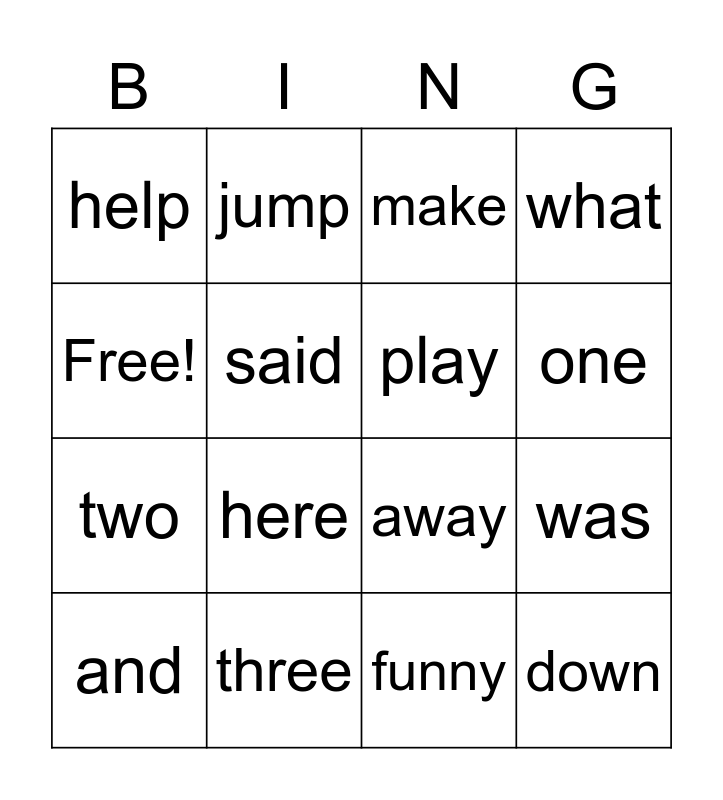 This bingo card has 16 words: three, was, make, help, two, jump, away, funny, Free!, said, and, what, here, one, play and down.