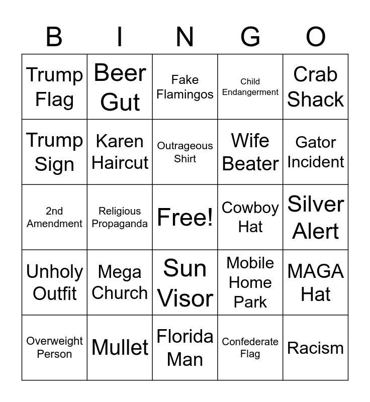 This bingo card has a free space and 25 words: Mega Church, Florida Man, Outrageous Shirt, Overweight Person, Crab Shack, Trump Flag, Trump Sign, Beer Gut, Cowboy Hat, Sun Visor, Wife Beater, 2nd Amendment, Mobile Home Park, MAGA Hat, Karen Haircut, Tattoos, Silver Alert, Fake Flamingos, Gator Incident, Religious Propaganda, Racism, Mullet, Unholy Outfit, Child Endangerment and Confederate Flag.