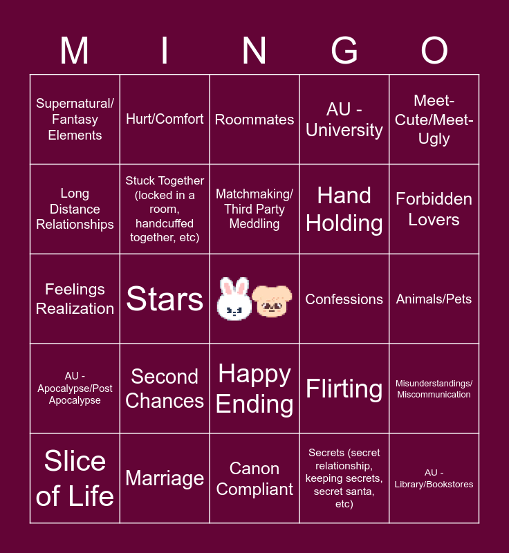 This bingo card has a free space and 24 words: Second Chances, Marriage, Matchmaking/ Third Party Meddling, Slice of Life, Meet-Cute/Meet-Ugly, Supernatural/ Fantasy Elements, Long Distance Relationships, Hurt/Comfort, Confessions, Happy Ending, Hand Holding, Feelings Realization, Flirting, Misunderstandings/ Miscommunication, Stuck Together (locked in a room, handcuffed together, etc), Secrets (secret relationship, keeping secrets, secret santa, etc), Animals/Pets, Roommates, Forbidden Lovers, Stars, AU - Library/Bookstores, AU - Apocalypse/Post Apocalypse, AU - University and Canon Compliant.