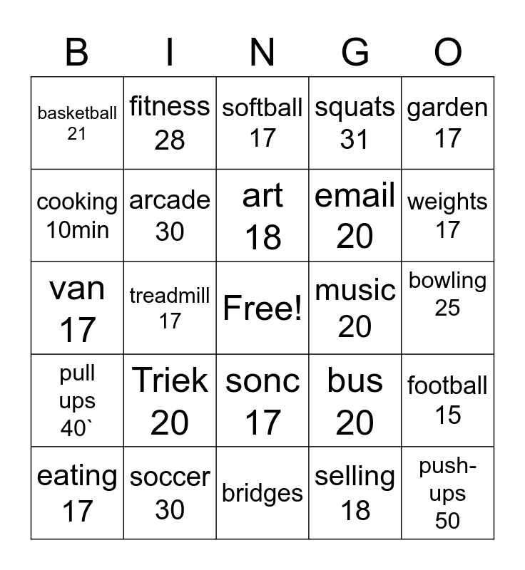 This bingo card has a free space and 24 words: Triek 20, soccer 30, art 18, eating 17, garden 17, basketball 21, cooking 10min, fitness 28, music 20, sonc 17, email 20, van 17, bus 20, football 15, arcade 30, selling 18, bowling 25, softball 17, weights 17, treadmill 17, push-ups 50, pull ups 40`, squats 31 and bridges.