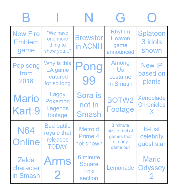 This bingo card has a free space and 24 words: Zelda character in Smash, Bad battle royale that releases TODAY, Pong 99, Lemonade, Splatoon 3 idols shown, New Fire Emblem game, "We have one more thing to show you...", Brewster in ACNH, BOTW2 Footage, Xenoblade Chronicles X, Mario Kart 9, Why is this EA game featured for so long, 3 minute sizzle reel of games that already came out, B-List celebrity guest star, Pop song from 2018, Arms 2, 6 minute Square Enix section, Rhythm Heaven game announced, New IP based on plants, N64 Online, Laggy Pokemon Legends footage, Metroid Prime 4 not shown, Among Us costume in Smash and Mario Odyssey 2.