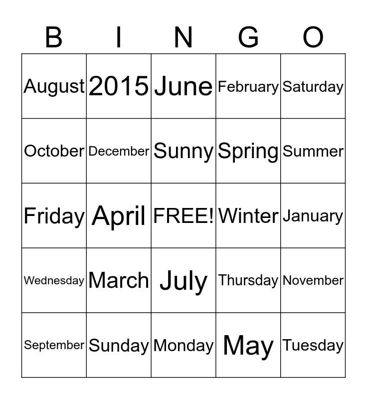 This bingo card has a free space and 24 words: March, Sunday, Sunny, September, Saturday, August, October, 2015, Winter, July, Spring, Friday, Thursday, November, December, May, January, June, Summer, April, Tuesday, Wednesday, February and Monday.