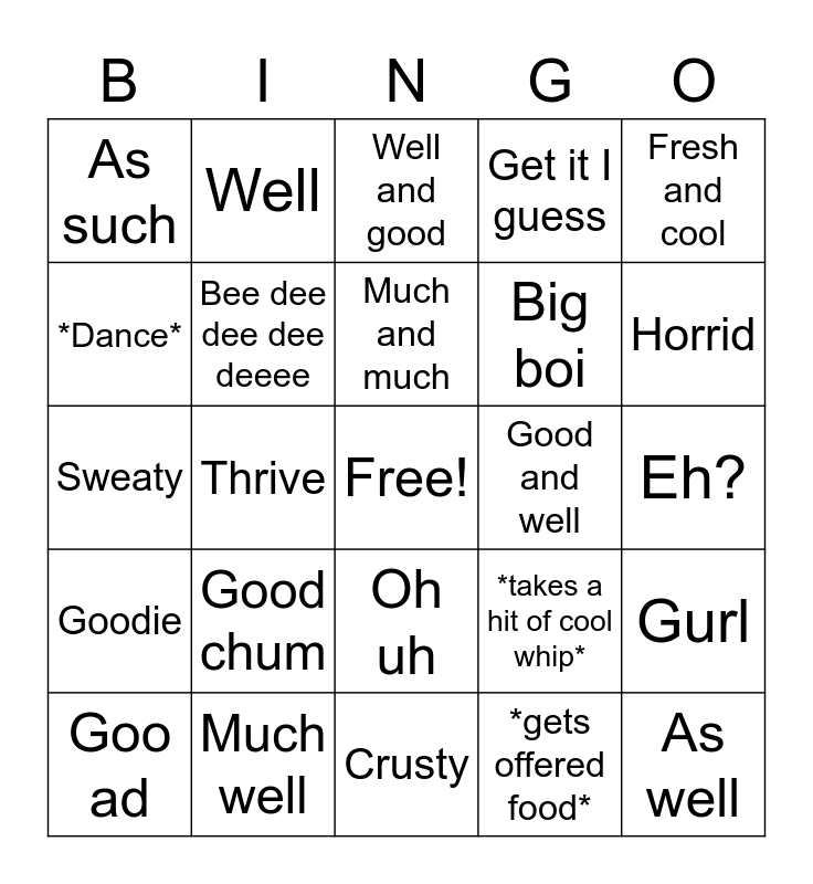 This bingo card has a free space and 24 words: Good chum, Much well, Much and much, Goo ad, Fresh and cool, As such, *Dance*, Well, Good and well, Oh uh, Big boi, Sweaty, *takes a hit of cool whip*, Gurl, Bee dee dee dee deeee, *gets offered food*, Eh?, Well and good, Horrid, Thrive, As well, Goodie, Get it I guess and Crusty.