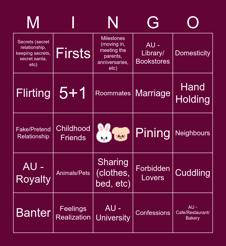 This bingo card has a free space and 24 words: Animals/Pets, Feelings Realization, Roommates, Banter, Domesticity, Secrets (secret relationship, keeping secrets, secret santa, etc), Flirting, Firsts, Pining, Sharing (clothes, bed, etc), Marriage, Fake/Pretend Relationship, Forbidden Lovers, Cuddling, 5+1, Confessions, Neighbours, Milestones (moving in, meeting the parents, anniversaries, etc), Hand Holding, Childhood Friends, AU - Cafe/Restaurant/ Bakery, AU - Royalty, AU - Library/ Bookstores and AU - University.