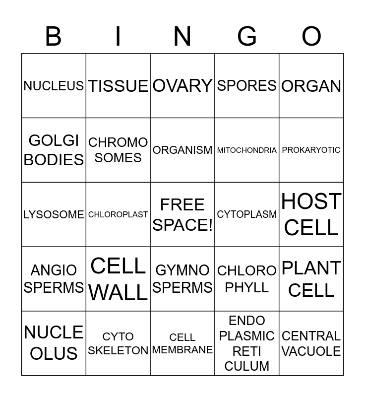 This bingo card has a free space and 24 words: CELL WALL, CYTO SKELETON, ORGANISM, NUCLE OLUS, ORGAN, NUCLEUS, GOLGI BODIES, TISSUE, CYTOPLASM, GYMNO SPERMS, MITOCHONDRIA, LYSOSOME, CHLORO PHYLL, PLANT CELL, CHROMO SOMES, ENDO PLASMIC RETI CULUM, HOST CELL, OVARY, PROKARYOTIC, CHLOROPLAST, CENTRAL VACUOLE, ANGIO SPERMS, SPORES and CELL MEMBRANE.