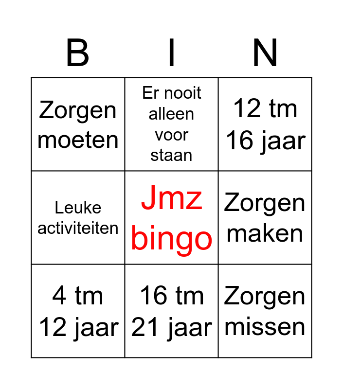 This bingo card has a free space and 8 words: Zorgen maken, 12 tm 16 jaar, Er nooit alleen voor staan, 4 tm 12 jaar, Zorgen moeten, Zorgen missen, Leuke activiteiten and 16 tm 21 jaar.