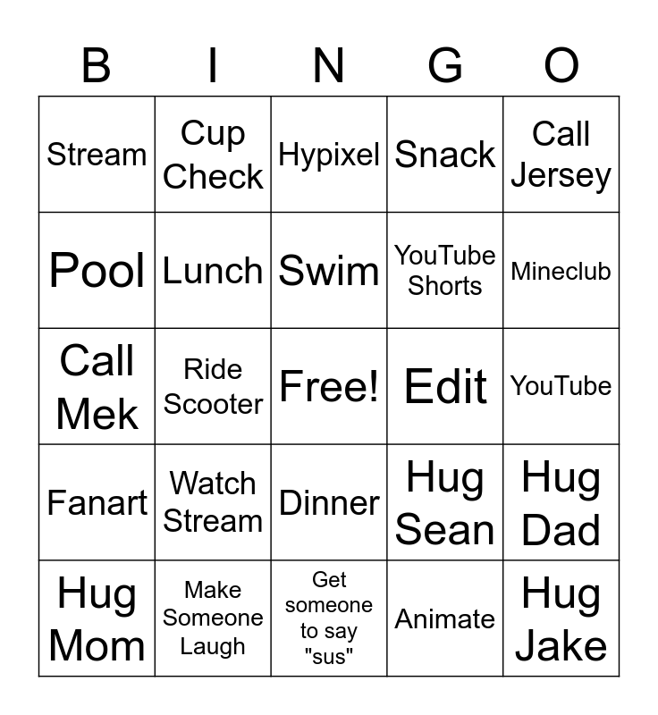 This bingo card has a free space and 35 words: 2hr Stream, 1hr Stream, Breakfast, Lunch, Dinner, Snack, Pool, Krav, Swim, YouTube, Call Mek, Call Jersey, Call Ari, Call iFli, Stream, Edit, Animate, Ride Scooter, Fanart, Hug Jake, Hug Sean, Hug Mom, Hug Dad, Make Someone Laugh, Hypixel, Mineclub, Minehut, Spotify, YouTube Shorts, YouTube, ASMR, Get someone to say "sus", Watch Stream, Cup Check and Trampoline.