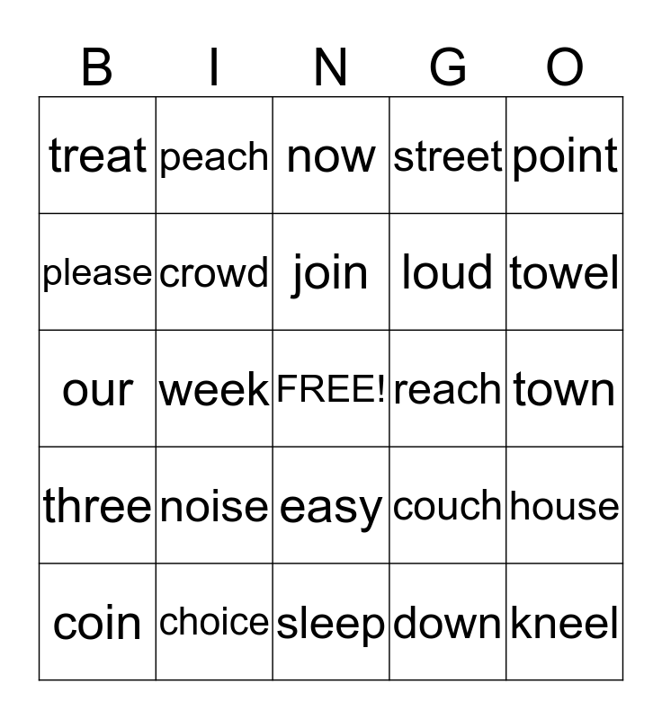 This bingo card has a free space and 24 words: noise, choice, join, coin, point, treat, please, peach, reach, easy, loud, our, couch, house, crowd, down, town, now, towel, week, kneel, three, street and sleep.