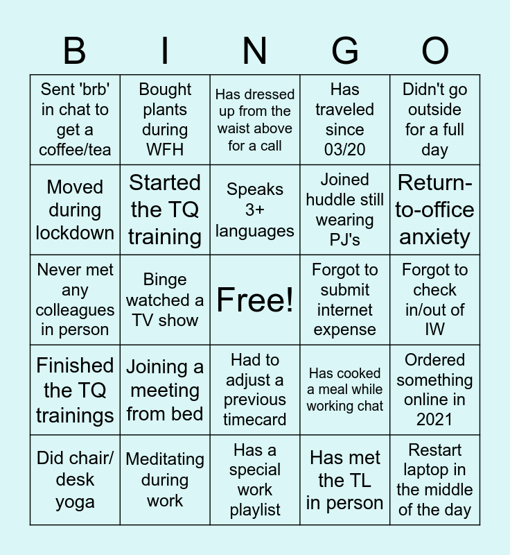 This bingo card has a free space and 55 words: Saw a colleague in person in 2021, Did chair/ desk yoga, Had your pet join a meeting, Sent 'brb' in chat to get a coffee/tea, Has a special work playlist, Went 'unavailable' during chat, Started the TQ training, Completed all non-TQ trainings, Joined huddle still wearing PJ's, Workout in the middle of the day, Has traveled since 03/20, VPN issues, Worked OT, "Relaunch Chrome in XX hours", Eating breakfast/lunch while working, Internet issues, Didn't go outside for a full day, Binge watched a TV show, Had a lockdown b-day, Restart laptop in the middle of the day, Forgot to submit internet expense, Turns camera on during huddles/ meetings, Has cooked a meal while working chat, Has dressed up from the waist above for a call, Has worked on a non-P2P/Games product, Speaks 3+ languages, Has met the TL in person, Has ordered delivery for all the meals in a day, Forgot to check in/out of IW, Ordered something online in 2021, Worked in bed, Ordered food online, Woke up less than 5 minutes before shift starting time, Worked in garden/balcony, Moved during lockdown, Never met any colleagues in person, Posted a photo/video of your pet in GIF Game of Office Nature chat, Finished the TQ trainings, Worked in the office, Forgetting to mute microphone, Bought plants during WFH, What's an office?, Adds BlueJeans backgrounds during calls, Missed a WeCare session, Joining a meeting from bed, Meditating during work, Gone on a walk during breaks/lunch, Started a new hobby, Became BFF's with a colleague, Return-to-office anxiety, "Is there a huddle today?", Submitted a timecard late, MyTE troubles, Had to adjust a previous timecard and "Can you see my screen?".