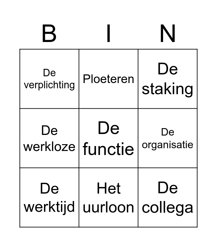 This bingo card has 12 words: De beroepsgroep, De collega, De functie, De organisatie, Ploeteren, De staking, Het uurloon, De vakbond, De verplichting, De werkloze, De werktijd and Werkzaam zijn.