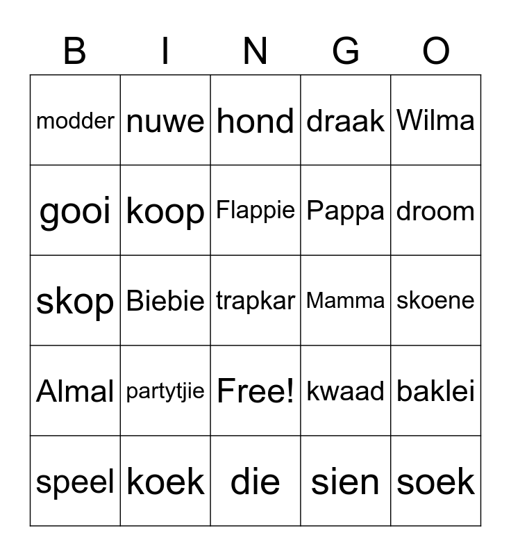 This bingo card has 26 words: Free!, sien, Flappie, koek, Wilma, modder, gooi, nuwe, skoene, kwaad, Pappa, skop, baklei, speel, Biebie, stout, draak, Almal, hond, trapkar, droom, die, Mamma, partytjie, koop and soek.