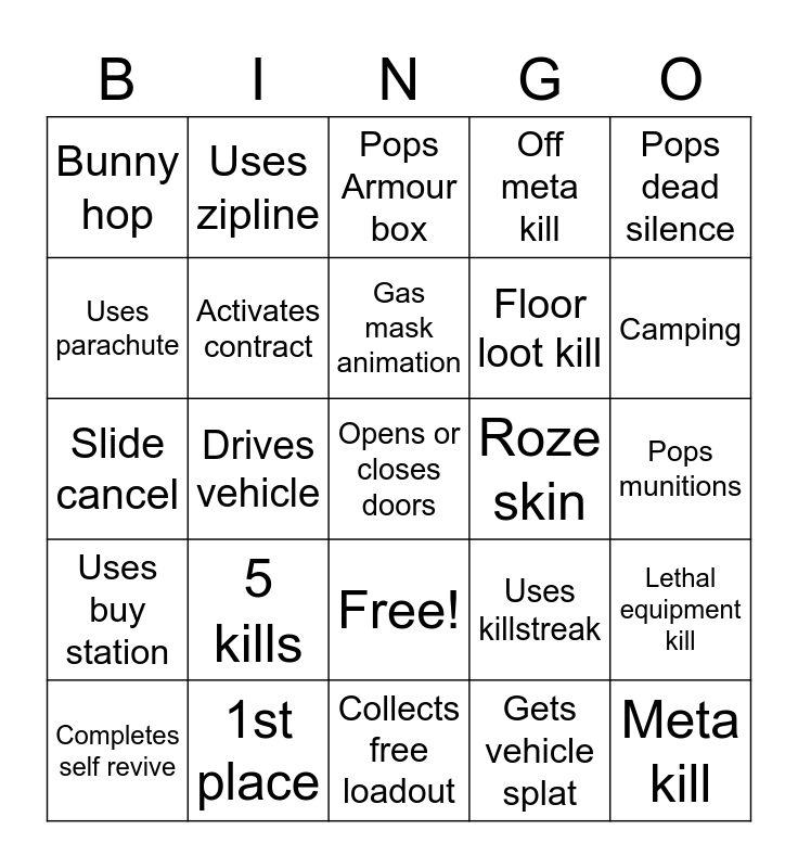 This bingo card has 26 words: Free!, Gets vehicle splat, Gas mask animation, 1st place, Pops dead silence, Bunny hop, Uses parachute, Uses zipline, Pops munitions, Uses killstreak, Floor loot kill, Slide cancel, Lethal equipment kill, Completes self revive, Drives vehicle, YY'ing, Off meta kill, Uses buy station, Pops Armour box, Opens or closes doors, Camping, Collects free loadout, Roze skin, 5 kills, Activates contract and Meta kill.
