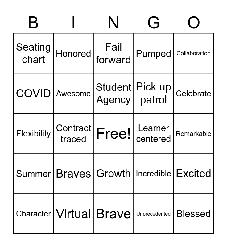 This bingo card has a free space and 50 words: humble(d), Blessed, Pride, Brave, Braves, Wow, Honored, Grace, COVID, Rose (to the occasion), Awesome, Pumped, Excited, Incredible, Off script, BVA, Student Agency, Learner centered, Resilience, Collaboration, Contract traced, Unprecedented, Seating chart, Pick up patrol, Social distance, Guys, Celebrate, Agenda, Fail forward, Growth, Agency, Ownership, Google meet, Zoom, Virtual, Personalized learning, Planning, Regroup, Extraordinary, Remarkable, Shout out, Inspire, Connect, Special, Character, Flexibility, 8th grade, Challenges, Summer and Relax.