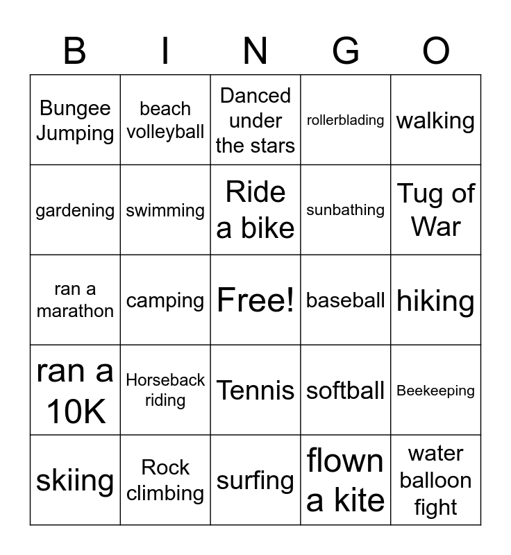 This bingo card has a free space and 29 words: skiing, ran a 5K, camping, windsurfing, Bungee Jumping, Danced under the stars, swimming, Horseback riding, baseball, Rock climbing, hiking, water balloon fight, surfing, flown a kite, Tug of War, sightseeing, Tennis, ran a 10K, walking, ran a marathon, softball, frisbee throwing, sunbathing, gardening, rollerblading, beach volleyball, Beekeeping, Ride a bike and Hide & Seek.