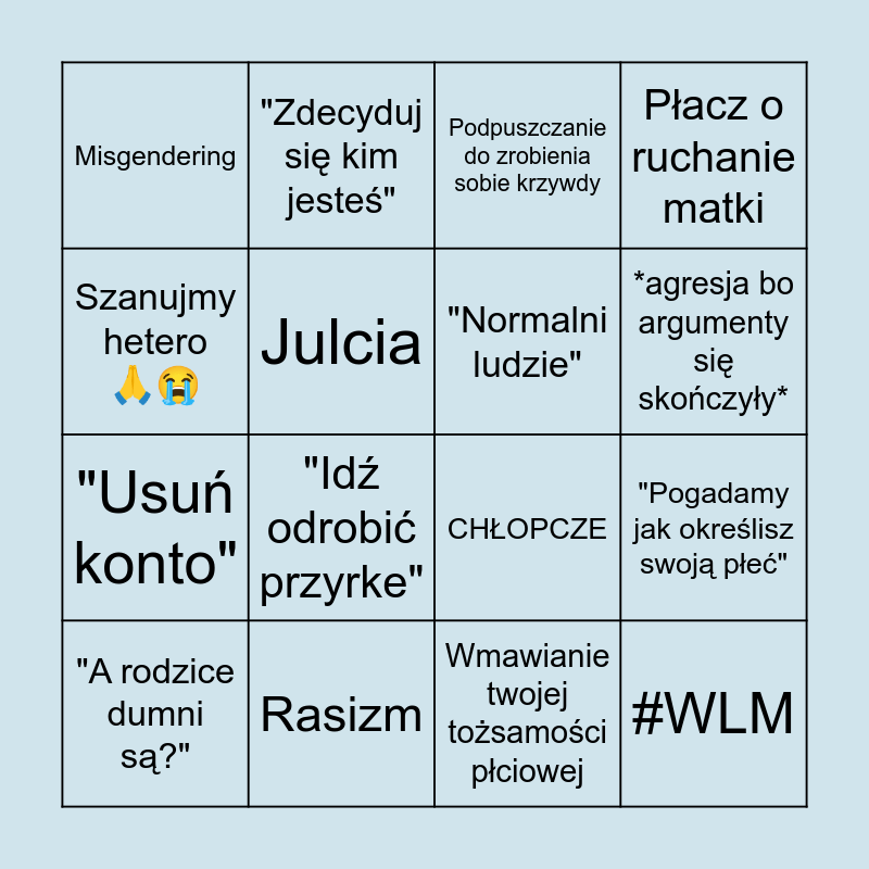 This bingo card has 16 words: Rasizm, "Pogadamy jak określisz swoją płeć", Podpuszczanie do zrobienia sobie krzywdy, Misgendering, "Usuń konto", "Zdecyduj się kim jesteś", CHŁOPCZE, Wmawianie twojej tożsamości płciowej, Szanujmy hetero 🙏😭, Julcia, "A rodzice dumni są?", Płacz o ruchanie matki, "Idź odrobić przyrke", *agresja bo argumenty się skończyły*, "Normalni ludzie" and #WLM.