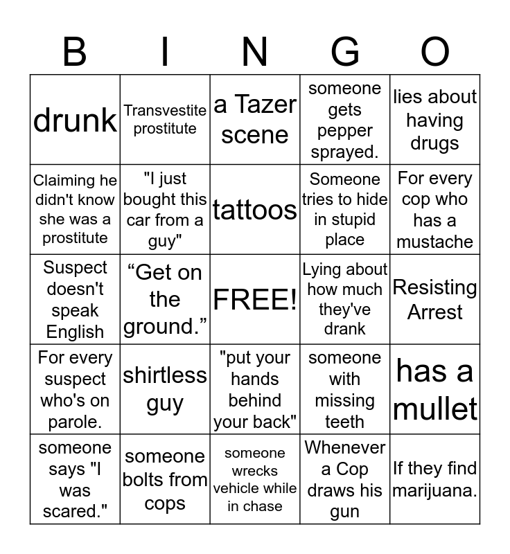 This bingo card has a free space and 24 words: shirtless guy, someone bolts from cops, tattoos, someone says "I was scared.", lies about having drugs, drunk, Claiming he didn't know she was a prostitute, Transvestite prostitute, Lying about how much they've drank, "put your hands behind your back", Someone tries to hide in stupid place, Suspect doesn't speak English, someone with missing teeth, has a mullet, "I just bought this car from a guy", Whenever a Cop draws his gun, Resisting Arrest, a Tazer scene, For every cop who has a mustache, “Get on the ground.”, If they find marijuana., For every suspect who's on parole., someone gets pepper sprayed. and someone wrecks vehicle while in chase.