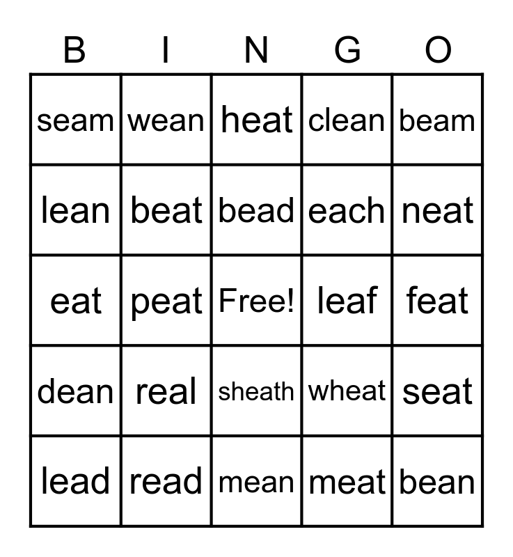 This bingo card has a free space and 24 words: real, read, bead, lead, beam, seam, lean, wean, leaf, sheath, each, eat, wheat, seat, beat, meat, feat, heat, neat, peat, bean, dean, clean and mean.