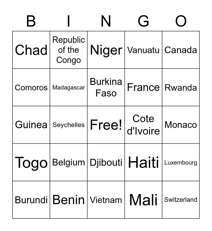 This bingo card has a free space and 24 words: Belgium, Benin, Burkina Faso, Burundi, Canada, Chad, Comoros, Republic of the Congo, Cote d'Ivoire, Djibouti, France, Guinea, Haiti, Luxembourg, Madagascar, Mali, Monaco, Niger, Rwanda, Seychelles, Switzerland, Togo, Vanuatu and Vietnam.